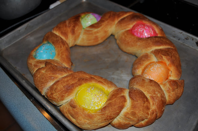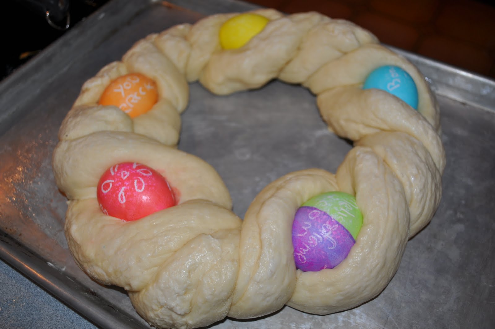 One thing the recipe didn't mention, but I found on another recipe: Do not cook the eggs before, they will bake along with the bread in the oven. I had already hard boiled and dyed mine when I found this out, so they were double cooked, and discarded after the bread was eaten. Also, you can add sprinkles to the top of the bread to bring more color in as well.